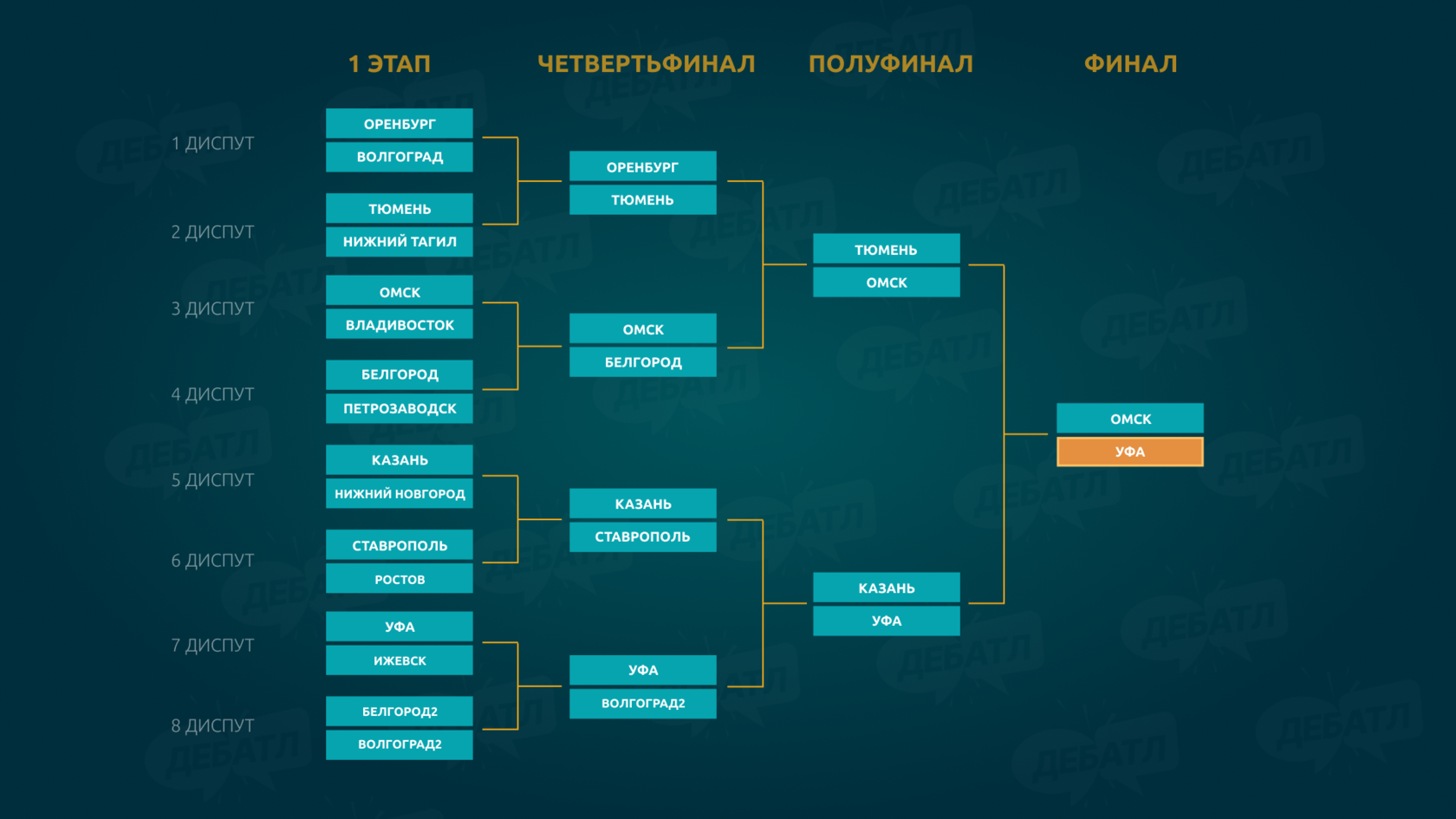 Темы для дебатов определяли организаторы проекта и случайным образом распределяли их между парами команд. Сторону в дебатах также выбирал жребий, поэтому точки зрения, которые отстаивали участники, необязательно могли совпадать с их собственным мнением.