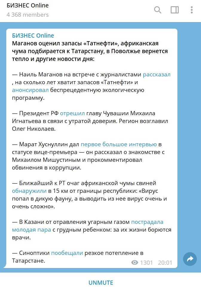 Канал подконтрольного ГК «ТАИФ» издания появился в феврале 2018 года. По аналогии с «Бизнес Online», редакция публиковала дайджесты основных новостей и ссылки на собственный сайт с короткими подводками – ни тебе аналитики, ни оценки произошедшего. За прошедшее время политика ведения ресурса не изменилась, впрочем, время от времени он пытается вызвать на диалог крупные региональные Telegram-каналы, но достаточно безуспешно.