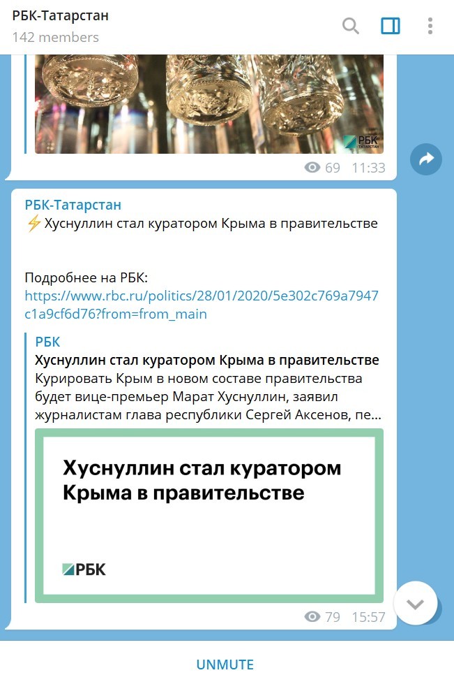 В декабре 2018 года «РБК-Татарстан» созрело для создания собственного канала в Telegram. Очевидно, что инициатором этого процесса стала Татьяна Ренкова, одна из основных авторов постов в официальный канал издания во время работы в Inkazan. В первой публикации редакция РБК пообещала публиковать ссылки на топовые материалы. Если изначально редакция публиковала посты без ссылки на сайт, то сегодня, по аналогии с каналами других СМИ, в ленте РБК остались лишь короткие подводки к новостям.