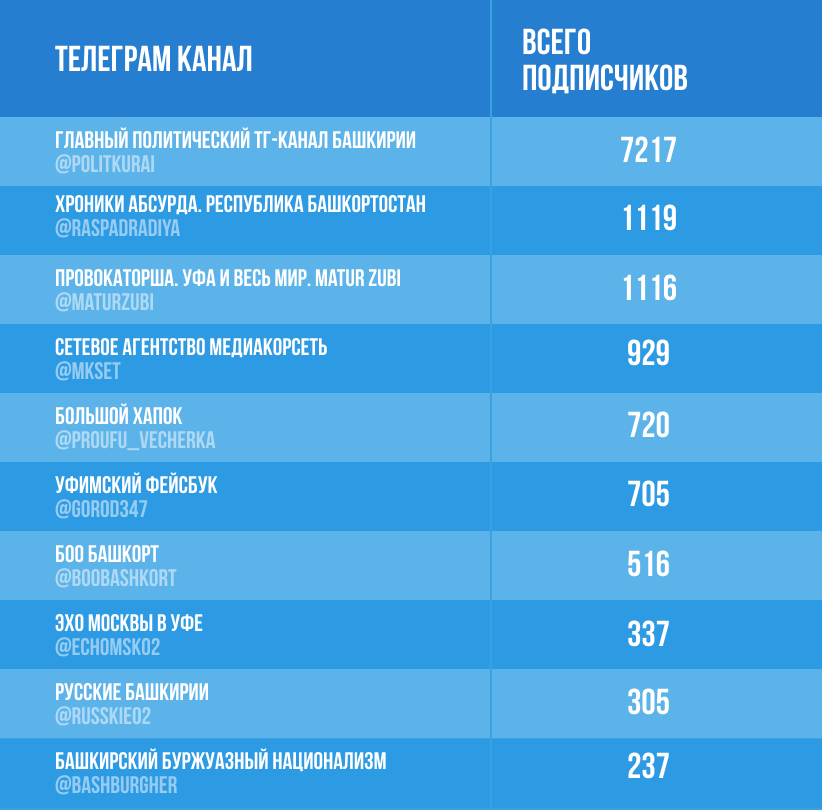 Поэтому первый рейтинг телеграм-каналов Башкирии ранжировали по количеству подписчиков. Ниже приводим краткую характеристику Top-10 Telegram каналов, пишущих на башкирскую повестку.