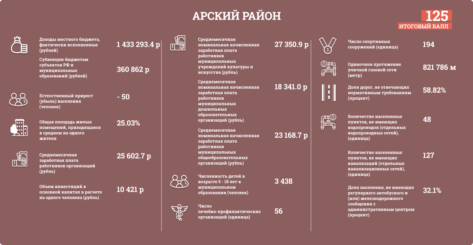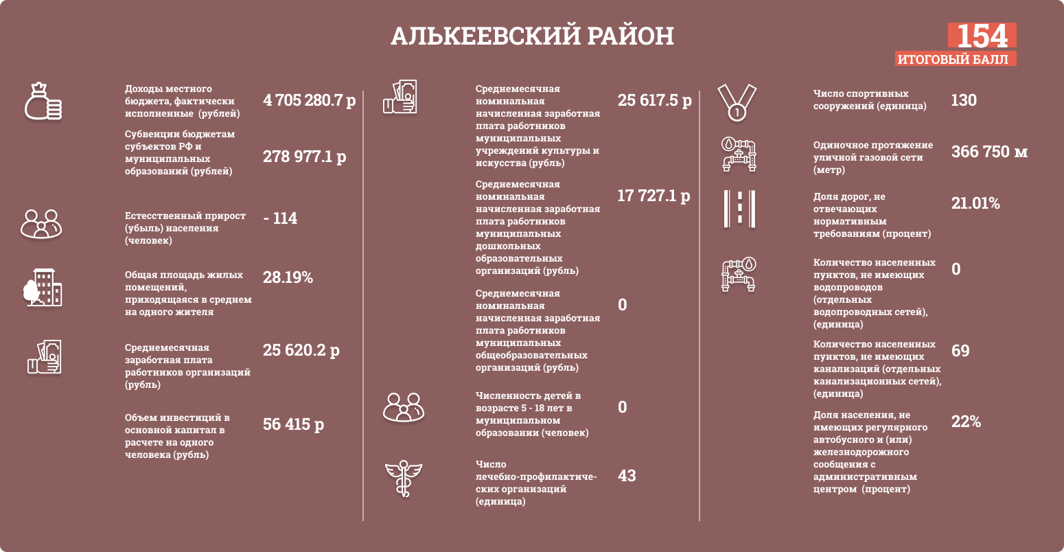Районам присваивались баллы в зависимости от положения в таблице. Чем больше значение — тем выше балл. Исключением стали показатели с негативными факторами, например, количество сел без водопроводов. Эти баллы вычитаются из общей суммы. Всего были проанализированы данные 43 районов и двух городских округов.